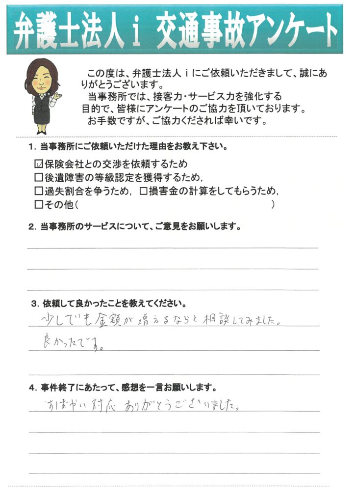 相手方保険会社から示談金の提示が有り、適切な金額であるか確認したく、相談にいらっしゃいました。