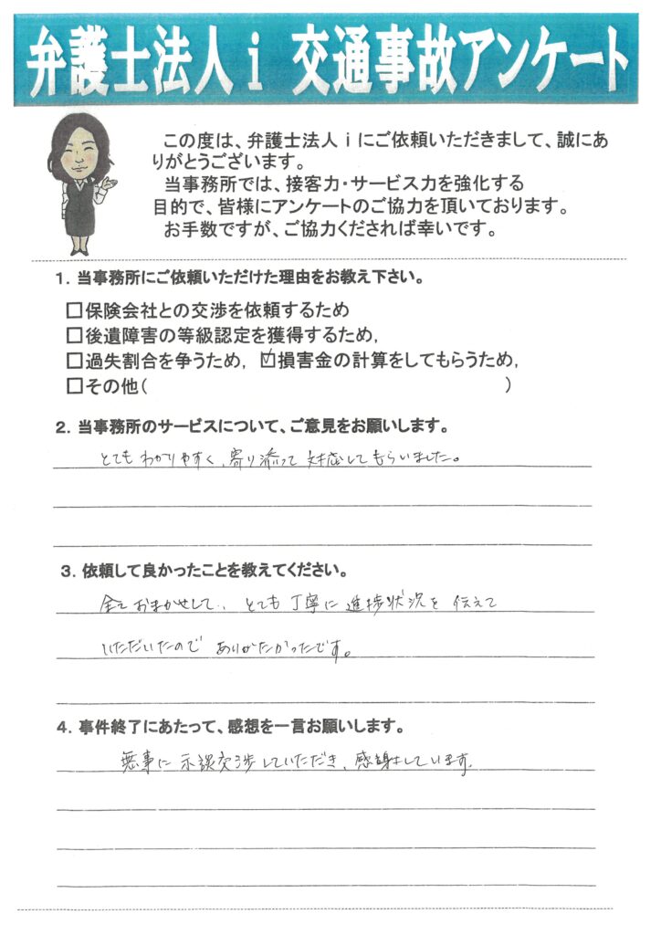 損害額を計算する基準には、いわゆる自賠責保険基準、任意保険基準、裁判基準というものがあり、自賠責保険基準が一番低く、裁判基準が一番高いです。弁護士が介入することにより裁判基準で交渉することができます。本件では、弁護士が裁判基準でXさんの損害額を計算したところ1117万円で、相手方保険会社と交渉した結果、944万円という金額で示談できました。