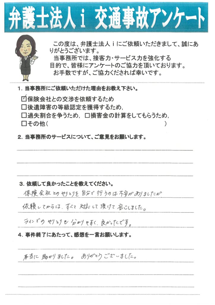 保険会社は、淡々と示談(解決)へ向けての案内が始まります。弊所では、交通事故の事件を専門分野で取り扱っており、法律相談時から被害者様の状況を確認し、状況に応じた最適な対応をご提案させていただきます。弁護士の介入時期は、保険会社にとっても状況が変わる場面が多く、重要と考えております。交通事故の事件の流れは、専門的な知識等も必要なため、是非弊所までお気軽にご相談ください。
