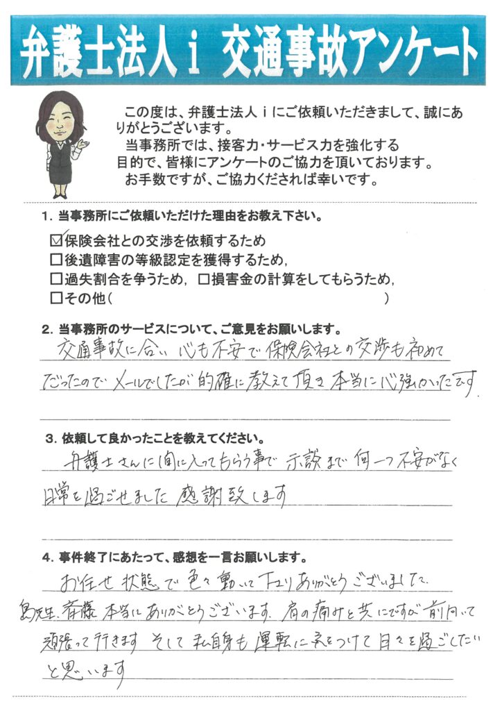症状固定時期を検討し、弊所にて後遺障害等級申請(被害者請求)をいたしました結果、14級9合が認定されました。相手方保険会社も後遺障害や逸失利益については、こちらから提示した損害額に合意していましたが、『兼業主婦』としての休業損害については否定しました。被害者からは、『役員報酬』を得ていると聞いているので主婦としての休業は認めないとのことでした。しかし、役員報酬を得ていた兼業主婦の休業損害についての判例や依頼者の状況などを主張し、約50万円の兼業主婦としての休業損害を獲得し、最終的な示談金も納得のいく結果となりました。