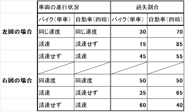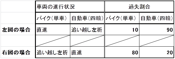 バイクが右折し、自動車が直進した場合の過失割合です。