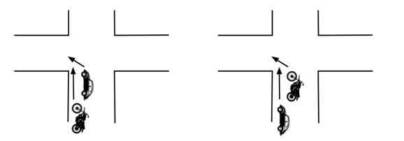 左図)バイク直進、自動車右折 右図)バイク右折、自動車直進